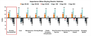 In Chart 1 from PRIZM Premier, the index for importance when considering buying EVs seems fairly consistent across all factors. However, “cost” and “home energy spikes” top the list with younger age categories who form the core of the EV market. Messaging that specifically addresses these concerns could facilitate additional sales. And since younger consumers generally view EVs positively, focusing on traditional factors such as premium features and available styles is also crucial. With EVs now available in sports cars, SUVs, and pick-up trucks, automakers have increased opportunities to appeal to diverse segments.